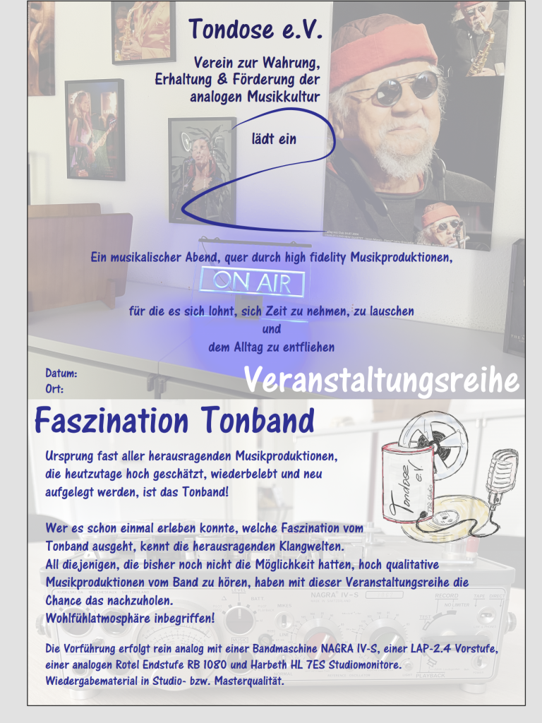 All diejenigen, die bisher noch nicht die Möglichkeit hatten, hoch qualitative Musikproduktionen vom Band zu hören, haben mit dieser Veranstaltungsreihe die Chance das nachzuholen.